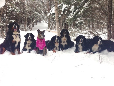 Mango moved to Canada and took this country by storm! She lived with a new group of friends in her big BEAR Bernese that kept her warm that first Winter as she had NEVER seen snow or cold like that!